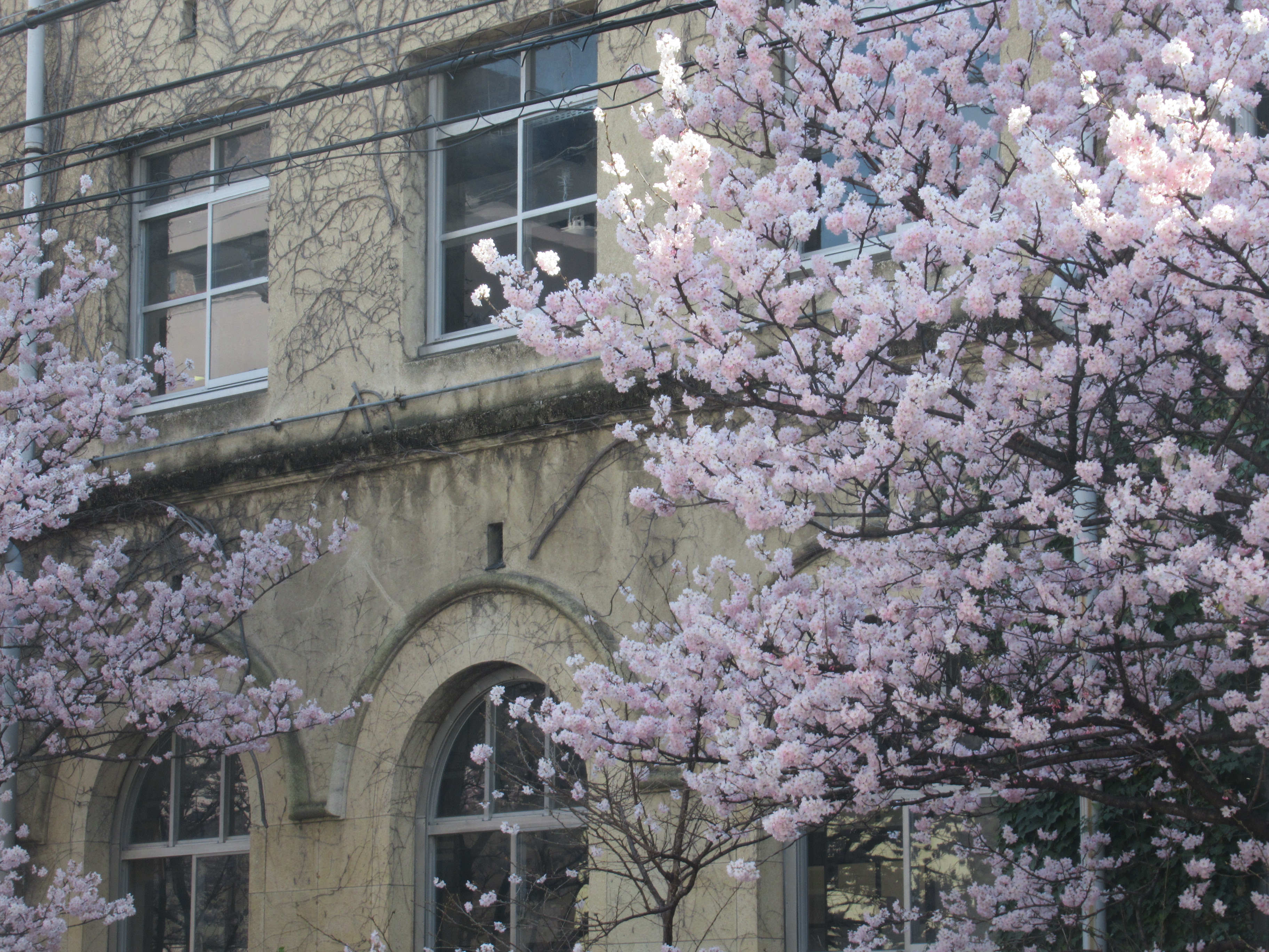 京都室町高辻の成徳中学校跡地の早咲き桜「春めき」です